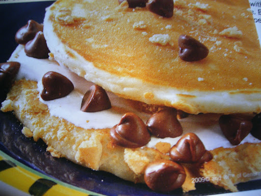 Spread about 1 tbsp. marshmallow creme over the crumbs side of each of 7 pancakes; arrange about 1 tablespoon milk chocolate chips over marshmallow creme on each. Top with another pancake, crumbs side down.