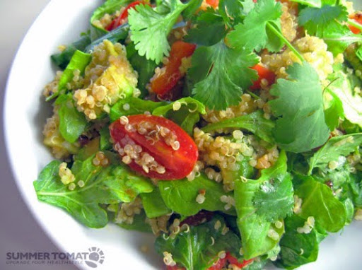Transfer quinoa mixture to a large serving bowl and add avocado, tomatoes and cilantro. Squeeze in juice of half a lime and add a few dashes of Tapatio or Tabasco to taste. Gently stir, being careful not to mash the avocado chunks.