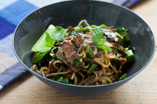 Heat a medium pot of water to boiling on high. Wash and dry the fresh produce. Cut the Chinese broccoli into bite-sized pieces. Peel and mince the garlic and ginger. Pick the mint leaves off the stems. Cut the lime into wedges. Thinly slice the beef.