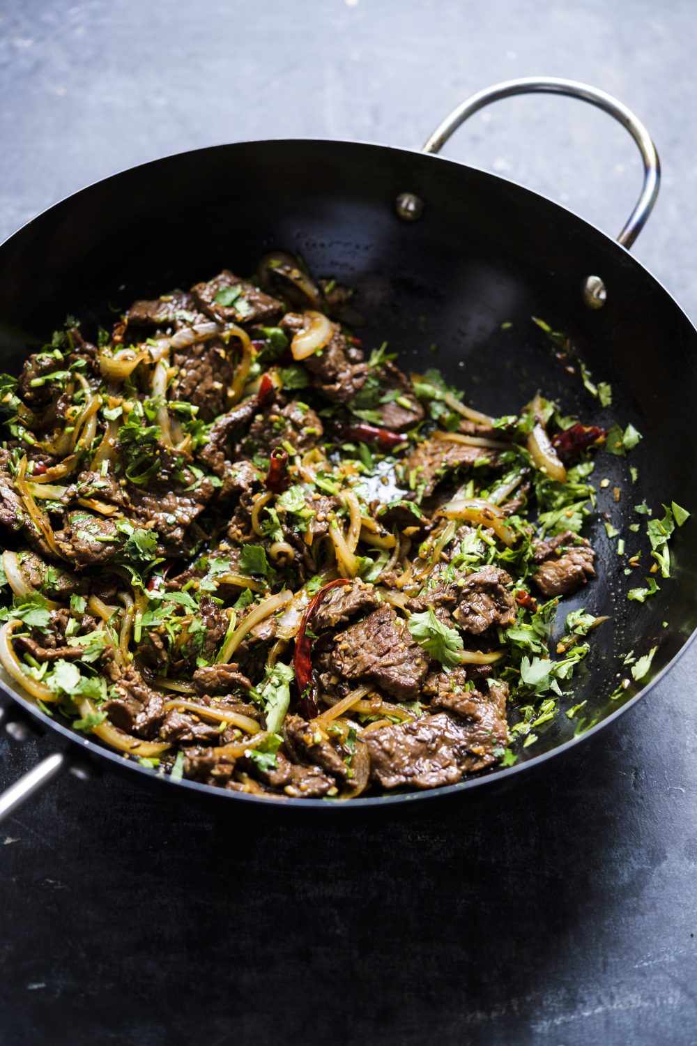 Return the wok to high, add 1 teaspoon of grapeseed oil, then arrange half of the beef in a single layer on the bottom and up the sides of the wok. Cook, undisturbed, until deeply browned on the bottom, 1 to 2 minutes. Stir, scraping the bottom and sides, and cook until no pink remains, 60 to 90 seconds. Transfer to the bowl with the onion. Repeat with the remaining oil and beef.