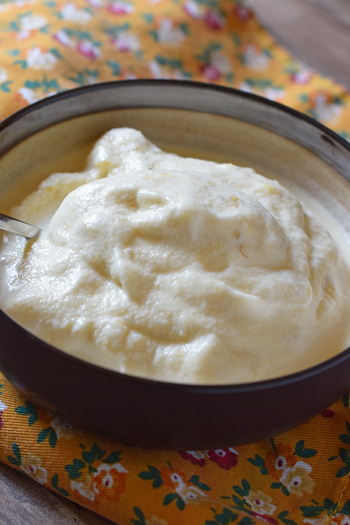 Pour the mixture into the ice cream maker. Finish topping it off with whole milk, making sure to fill it about 3/4 of the way full, leaving room for expansion as it freezes.