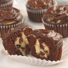 Delicious! A dollop of cheesecake filling hides in each of these rich chocolate cupcakes. Top them with melted chocolate chips and some colored sprinkles for a birthday treat.