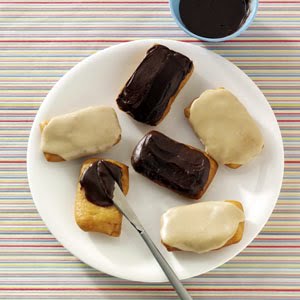 For chocolate frosting, in a microwave, melt chocolate and butter. Stir until smooth. Stir in remaining ingredients. Spread over cooled long johns; let stand until set. Yield: 2 dozen.