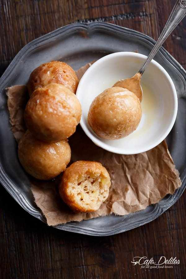 Dip each donut hole into the glaze and flip with a spoon to evenly coat. Allow excess glaze to drip off and place on a baking tray lined with baking/parchment paper until glaze has set.
