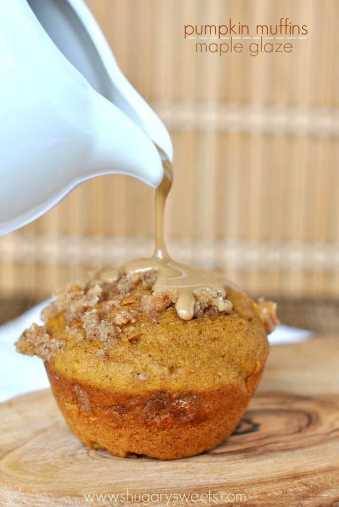 Soft, moist Pumpkin Muffins topped with a Cinnamon Toffee Streusel and Maple Glaze. Fall has arrived!