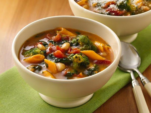 Stir in broccoli, spinach, beans and tomatoes. Cook 5 minutes longer, stirring occasionally, until vegetables are thoroughly heated. To serve, sprinkle each serving with 1 tablespoon cheese.