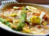3 Place 1/2 of the asparagus in the bottom of a greased 1 1/2 quart shallow baking dish. Sprinkle with 1/2 of the chopped eggs. and dot with 1 tablespoon butter. Sprinkle 1/2 teaspoon salt and 1/2 teaspoon cayenne pepper over all.