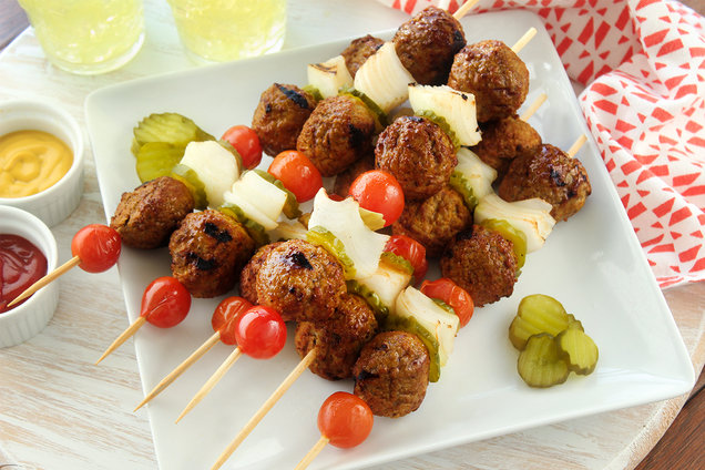 Flip skewers. With the grill cover down, grill for 5 more minutes, or until meatballs are heated through and onion has softened.