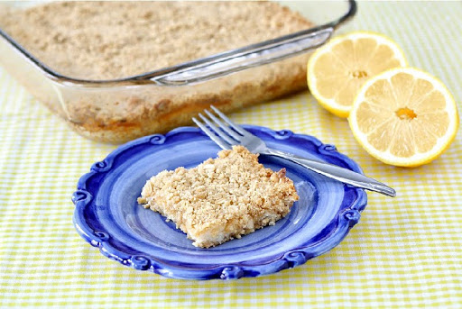 Press half of the streusel (dry) mixture into a lightly greased 9×13 baking dish. Pour the lemon mixture over top. Finish by sprinkling remaining streusel over the top of the lemon filling. Bake for 25-30 minutes. Cool completely then store in the refrigerator.