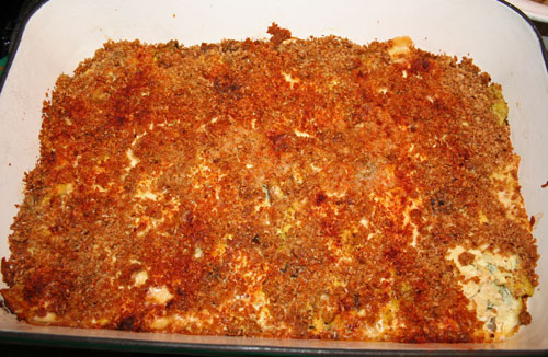 In morning, melt ¼ lb. butter (I only use about ¼ cup) pour over top. Cover with special K or crushed Corn Flakes. Bake, uncovered, 1 hour at 350°. Let sit 10 minutes before serving.