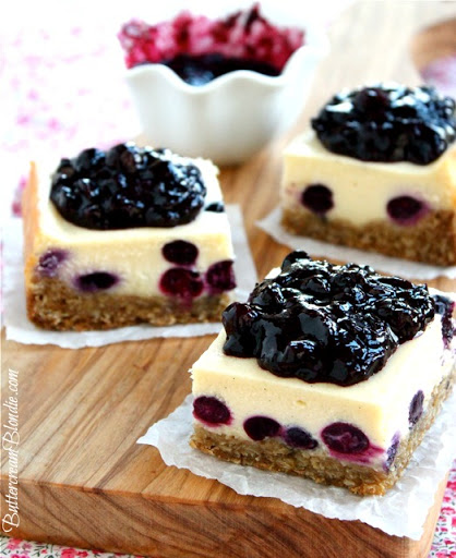Pour batter on top of cooled cookie crust and sprinkle with remaining blueberries.