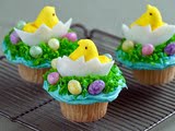 Frost a cupcake with fluff frosting. Press a circle of coconut grass on top. Nestle the malted eggs on top of the grass. Gently press the peep onto the center of the grass. Cut the white Airhead into a 1/2 oval shape; trim one side so it has a cracked egg jagged edge. Place egg next to chick.