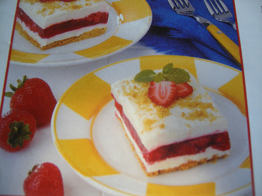 In a small mixing bowl, beat the cream cheese, sugar, vanilla, and salt till smooth. Fold in whipped cream. Spread half over cooled crust. Cover and refrigerate remaining cream mixture. Pour gelatin mixture over filling; refrigerate till firm. Top w/ remaining cream mixture. Refrigerate overnight. Garnish w/ fresh berries.