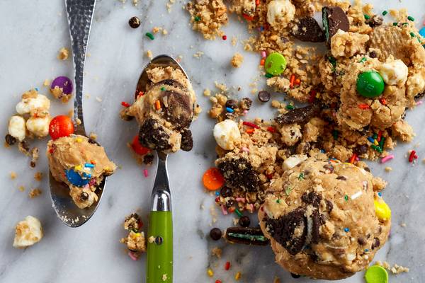 Fold in the chocolate chips, M&Ms, mini marshmallows, if using, the cookie pieces and rainbow sprinkles by hand.