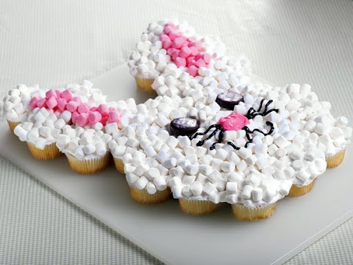 2. Pour bag of miniature marshmallows into large shallow bowl. Spoon 2 tablespoons of the frosting into small bowl; tint with food color to desired shade of pink for nose; set aside. Pipe or spread remaining frosting on cupcakes (frosting will be slightly mounded). Press top of each cupcake into marshmallows, covering top completely. Place cupcakes on platter as shown on diagram, fitting snugly together. Sprinkle leftover marshmallows as needed to fill in any gaps between cupcakes forming face.