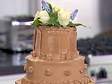 Place the 8-inch cake on a serving plate, flat side up. Frost the top of that layer with buttercream. Place the 6-inch cake in the center of the top of the 8-inch cake, flat-side up, and frost the top and sides. Place the 4-inch cake in the center of the top of the 6-inch cake, flat side down. Frost the top and sides of that layer with buttercream. Spread any remaining buttercream over the cake evenly.