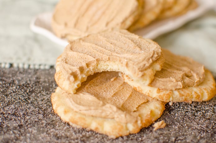 Once the cookies are completely cool, cream together all of the frosting ingredients until light and fluffy. Frost each cookie, sprinkle with extra cinnamon and sugar if desired.