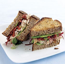 Put a lettuce leaf on 4 of the bread slices, then top with the chicken salad, carrot mixture, another lettuce leaf, and another slice of bread.