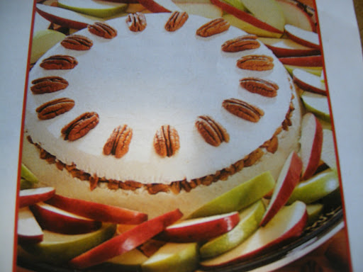 Before serving, invert onto a plate and remove plastic wrap. Arrange pecan halves on top. Serve w/ apples or crackers.