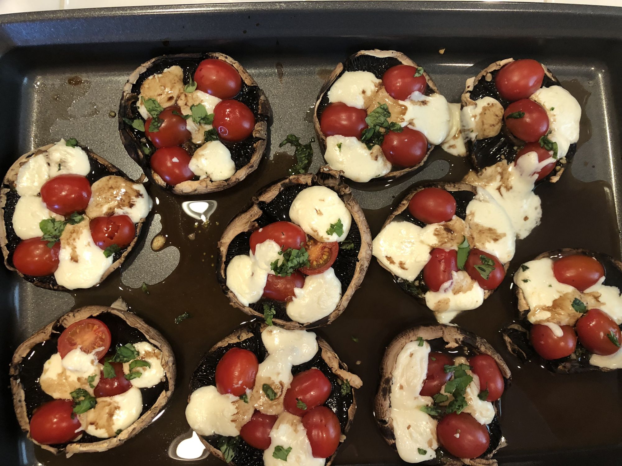 Flip and brush any remaining garlic over the insides of each cap. Fill each mushroom with the mozzarella slices and tomatoes, and grill/broil until cheese has melted and golden in color (about 8 minutes).