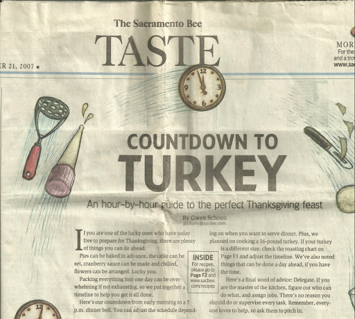 This is an Hour by Hour guide to a NO STRESS perfect Thanksgiving or any Holiday Dinner. It was printed in Nov. 2007 in the Sacramento Bee by writer Gwen Shoen, and I have used it ever since. You can use it for a Prime Rib dinner also, by adjusting the cooking time. I just do the cooking part and the rest of the family does the decorating and table setting. I decided to put it on Keyingredient because my newspaper is getting worn. I couldn't do it without this!!!