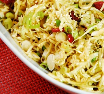 In a large bowl combine cabbage, scallions, and cranberries. Pour dressing over everything, and toss well. Cover and refrigerate for at 1-3 hours before serving. Toss again just before serving. Garnish with optional sesame seeds.