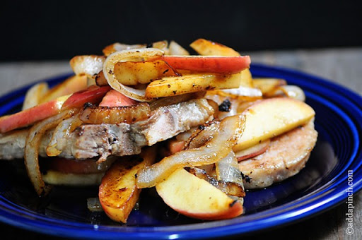Place skillet over medium-high heat. Drizzle with olive oil to coat well. Sear pork chops on both sides until nice and brown. Reduce heat to medium and add salt and pepper, apples, and onion slices. Cook until pork chops are cooked throughout and juices run clear when pierced with a fork.