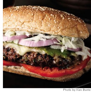 This spicy burger is served on an oblong roll, slathered with a spicy chipotle mayonnaise and topped with roasted Anaheim peppers and a delicious slaw.