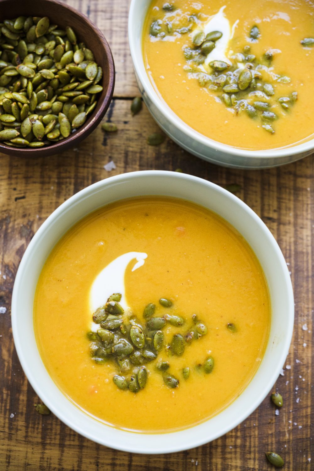 In a blender and working in batches, puree the squash mixture and its cooking liquid, processing until mostly smooth, 15 to 30 seconds. Return the pureed soup to the pot. Stir in the yogurt and heat over low, stirring occasionally, just until warmed; do not allow the soup to simmer. (Alternatively, use an immersion blender to puree the squash mixture and its cooking liquid directly in the pot, then stir in the yogurt; the soup will not need reheating if pureed in the pot.) Taste and season with salt. Ladle the soup into serving bowls and top with additional yogurt and spiced pumpkin seeds.