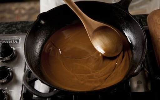 This dark roux is a nice milk chocolate color. This is the stage where people will make gumbo or other Cajun specialties like etouffee. It not only adds a very rich flavor but it’s what gives the gumbo that nice deep color. At this point roux does not have a lot of thickening power, which is why Cajun and Creole cooks will add file powder at the end of cooking.