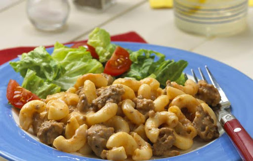 “Elbow macaroni, lean ground beef and lots of Cheddar cheese team up for a real home-run hit at suppertime.”