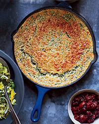 Bake the spoon bread in the center of the oven for about 45 minutes, until golden. Let cool slightly, then serve.