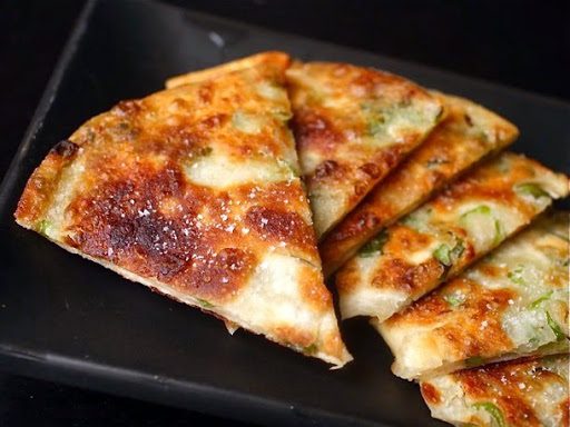 Paint with another layer or sesame oil, sprinkle with 1/2 cup scallions, and roll up like a jelly roll again. Twist into a spiral, flatten gently, and re-roll into a 7-inch disk. Repeat steps two and three with remaining pancakes.