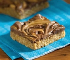 4.Sprinkle with chocolate chips; top with small spoonfuls of peanut butter. Let stand 5 minutes; spread peanut butter and chocolate over bars, swirling to marbleize.