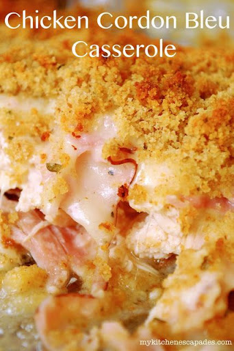 Layer in order chicken ham, and cheese. Pour sauce over and cover with the