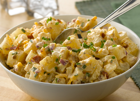 3.Gently stir potatoes into dressing until well coated. Sprinkle with cheese, bacon, and red onion; cover and refrigerate until ready to serve. Stir toppings in just before serving.