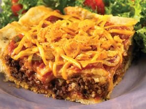 3.Top batter with taco meat filling. Pour salsa evenly over meat; sprinkle with shredded cheese and corn chips.