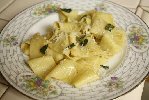 While your pasta cooks, melt butter in a 12 to 14-inch saute pan and continue cooking until golden brown color ("noisette") appears in the thinnest liquid of the butter.