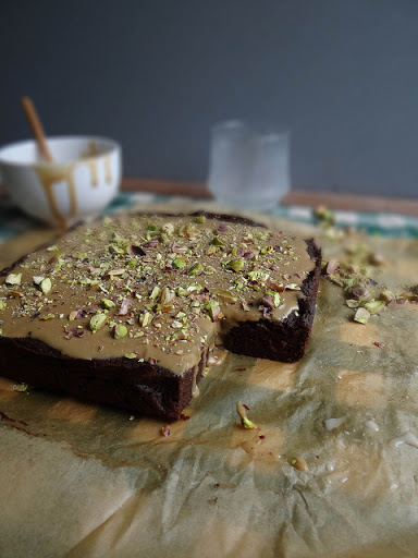 Pour glaze over cooled brownies and sprinkle with chopped pistachios. Store brownies in the fridge up to 3 days or at room temp for 1 day.