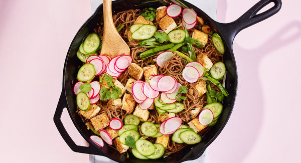 Drain the tofu in a colander, or dry on paper-towel lined plate while you prep the remaining ingredients, about 10 minutes. Meanwhile, bring a small pot of water to a boil for the soba noodles.