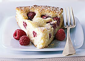 4. Bake about 35 minutes or until a toothpick inserted near the center comes out clean. Cool in pan for 10 minutes. Sprinkle with powdered sugar. Serve warm. If desired, garnish each serving with additional raspberries.