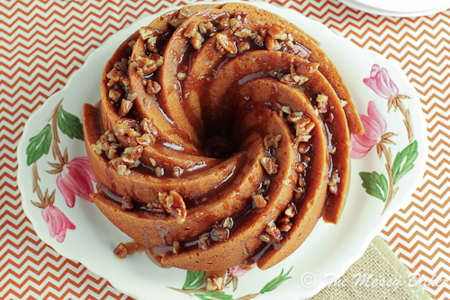 GLAZE: While the cake is baking, bring brown sugar, butter, and maple syrup to a boil in a small saucepan over medium heat. Boil for 2 minutes, then add the pecans. Remove from heat and stir in the bourbon.