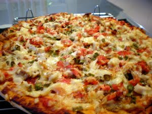 2.Place pizza crust on cookie sheet. Spread with barbecue sauce. Scatter chicken over top. Sprinkle evenly with red pepper, green pepper and onion. Cover with cheese.