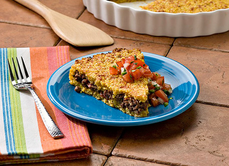 3. With the back of a spoon, press cornmeal mixture into pie plate. Pour meat filling into pie plate, and spoon the other half of cornmeal mixture on top. Spread over meat filling and lightly press down with back of spoon.