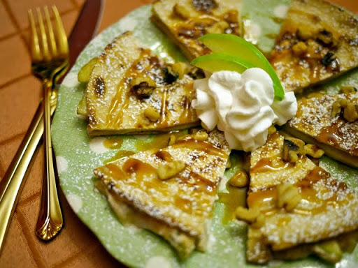- Garnish: powdered sugar, caramel ice cream topping, walnuts, whipped cream.