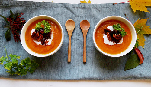 to serve the soup ladle into bowls & top with candied pecans. if desired "creme fraiche" can be added by combining vegan sour cream and almond milk until desired consistency is reached.