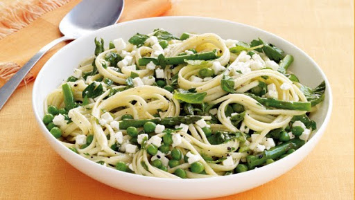 1. Cook asparagus in an 8-qt pot of well-salted boiling water until just tender, 4–6 minutes. Transfer with a slotted spoon to a bowl. Add peas to boiling water; cook 2 minutes. Transfer peas to bowl. Add linguine to boiling water; cook to al dente.