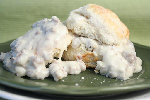 Add the meat and onions and serve over cooked potatoes or biscuits, split in half, fresh from the oven.