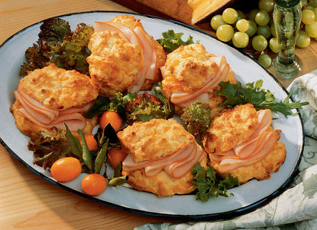 5. To serve, slice scones in half and fill with small slice of turkey. Arrange on serving tray.