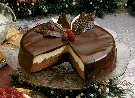 6. For the glaze, melt the chocolate and whipping cream over low heat, stirring constantly. Spread over cheesecake. Chill until serving time.